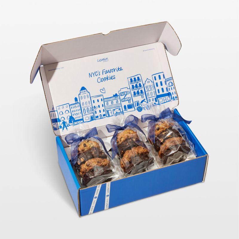 Levain Bakery, a New York City culinary icon, is revered for its handcrafted cookies made of simple, delicious ingredients. This assortment tempts with three each of the bakery's classic cookie varieties: chocolate chip walnut, dark chocolate with chocolate chip, dark chocolate peanut butter chip, and oatmeal raisin. Each six-ounce cookie is wrapped in a cellophane bag hand-tied with a blue ribbon. Ready to eat, the 12 cookies can also be gently warmed in the oven or microwave to achieve peak melty goodness.