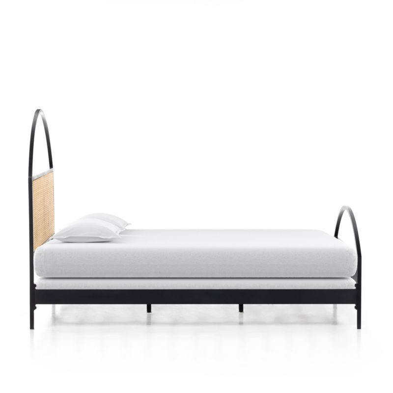 Inspired by our popular accent chair, Libby brings of-the-moment caning to the bedroom. An iron frame outlines the bed in black, curving graceful open arcs at both ends. Inset panels of woven cane give the head- and footboard a casual, breezy feel. Whether your style trends Deco or coastal, Libby's versatile design brightens any bedroom with its fresh mix of materials. The Libby cane bed is a Crate & Barrel exclusive.