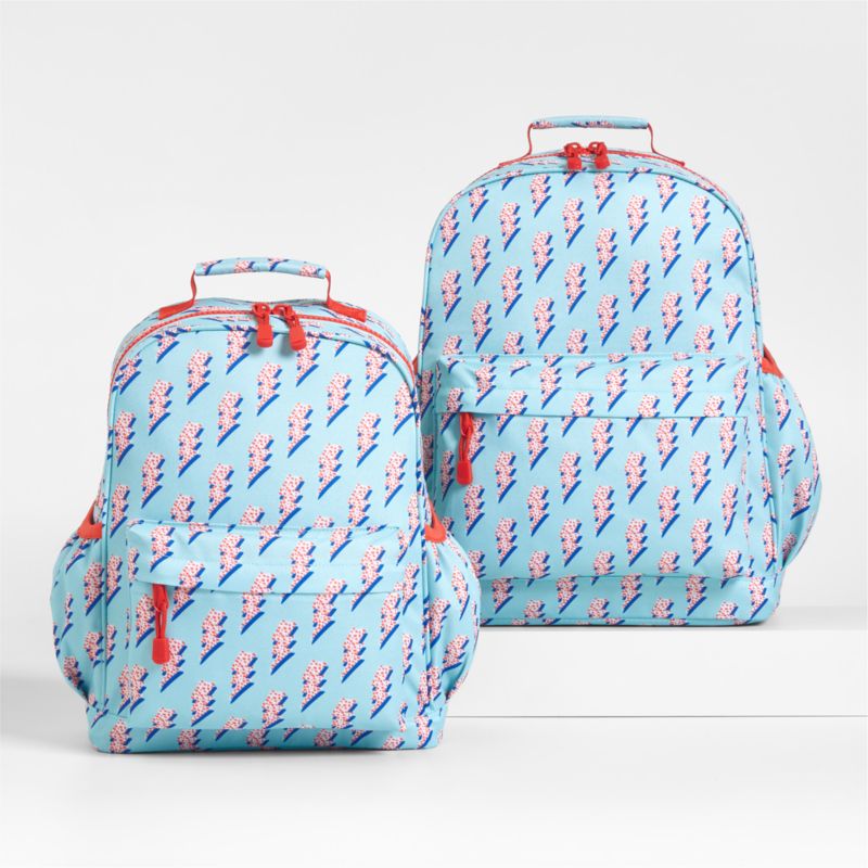 A backpack that's extra comfy and ready to handle daily adventures. White lightning bolts with red polka dots amp up the excitement of our aqua large knapsack trimmed in red. It's constructed of supremely durable polyester made from recycled water bottles and has a roomy interior to hold everything your kid needs—books, school supplies, extra layers. There's even a padded pocket to keep their tablet protected. Outside pockets hold snacks, water bottles and more. Pair this book bag with the matching Lightning Bolts water bottle and lunch box in aqua for supercharged style at the schoolyard and beyond.