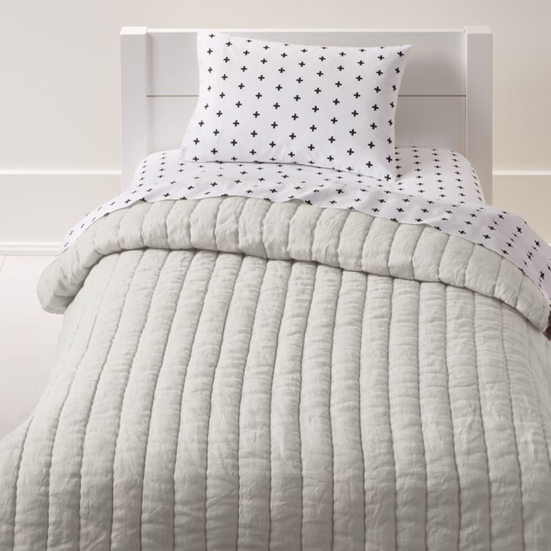 We dressed up our Linen Toddler Bedding to make it look its absolute best. We started by giving the crib quilt a simple, solid color palette that makes it stand out when you want, or make a statement if the mood is right. We also adorned it with playful, quilted details that add extra depth and texture to any nursery. And, if that wasn't enough, we decided to make it more comfortable that you can even imagine. Round out the look with the coordinating Crib Skirt.