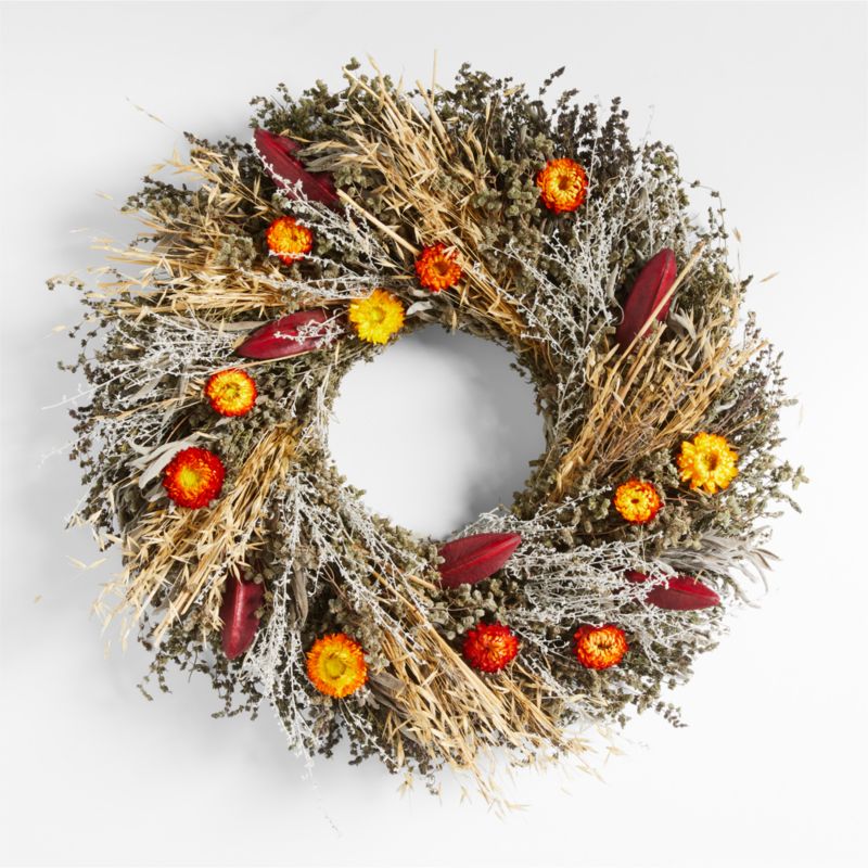 This hand-assembled wreath preserves the beauty of the autumn landscape. Enlivened by vivid orange and yellow strawflowers and red leaves, the fall wreath unites hand-harvested wheat, savory, marjoram and artemisia for an organic look. We love it displayed on a front door, above a mantel or on a dining table encircling a hurricane candle holder.