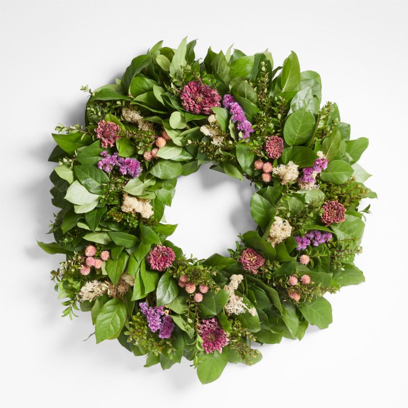 Glossy boxwood and silver eucalyptus leaves create a verdant foundation for this flower-spiked wreath. Fragrant lavender, globe zinnia, stock, statice and a touch of white reindeer moss pepper the wreath with springtime color and texture. Procured fresh from a family farm, the cut stems are hand-selected to create this large floral wreath. The live wreath dries beautifully and once dried will last for months.
