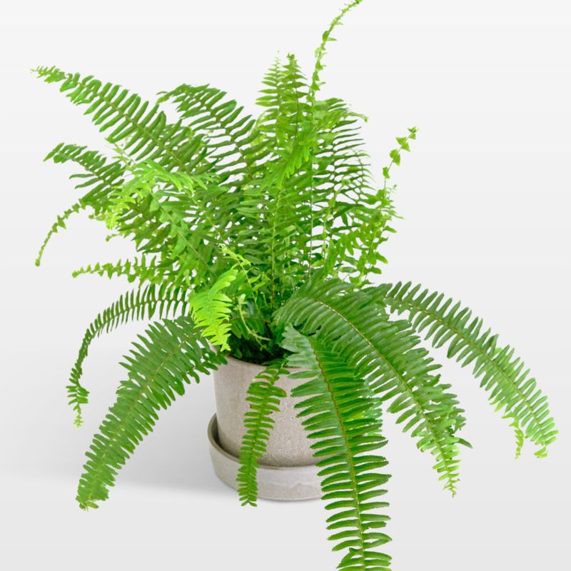 Green up your living space with this lovely fern. Indigenous to Australia, the lush evergreen plant delights with large, gracefully arching fronds. The fern thrives in medium-to-bright indirect light and benefits from occasional misting to keep it looking its best. Each live plant is potted with soil in a clean-lined pot with saucer, covered with a tan reactive glaze for textural contrast.