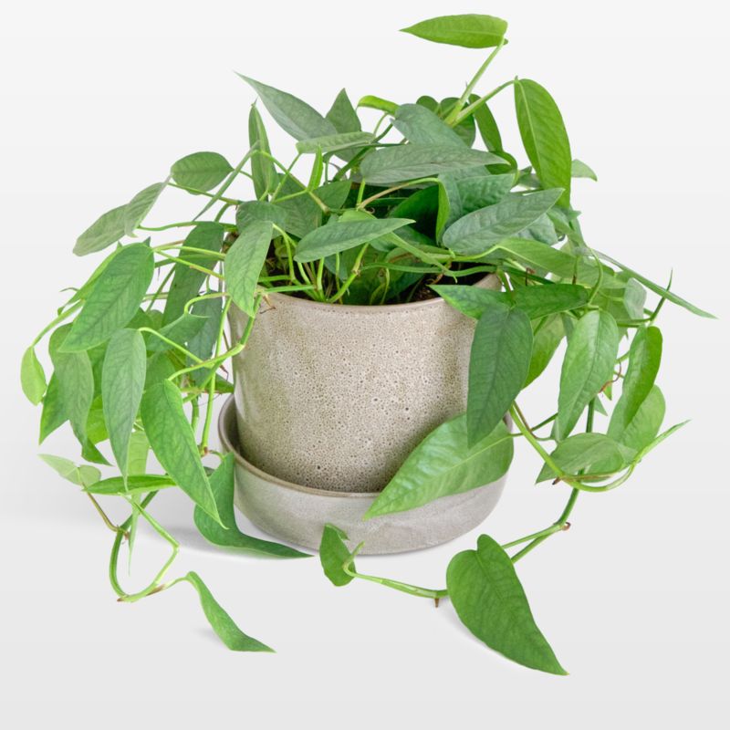 Green up your living space with a lush pothos plant. Native to Cebu island in the Philippines, the stunning pothos variety has slim, silvery green-blue leaves. This tropical climber can be trained to wind on a trellis or trail from a hanging basket. Pothos thrives best in medium-to-bright indirect light. Each live plant is potted with soil in a clean-lined pot with saucer, covered with a tan reactive glaze for textural contrast.