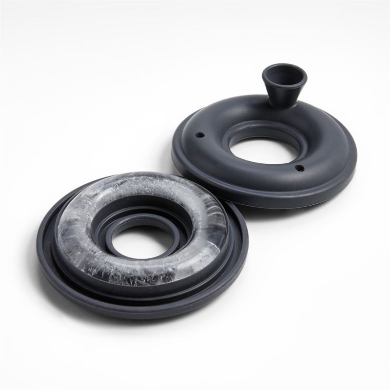 Ring in cocktail hour with our loop-shaped ice molds. The set's two black silicone molds freeze perfectly round and thick ice rings, adding a fun touch to beverages. Due to their size and substance, the ice loops melt more slowly than traditional cubes to keep drinks from diluting too quickly. To make the ice cubes, snap lid and base together, and fill from top hole with warm water until it reaches the smaller overflow hole, being careful not to overfill. Once the ice is frozen, slowly peel the top mold off, and push the ice up from the base to release.