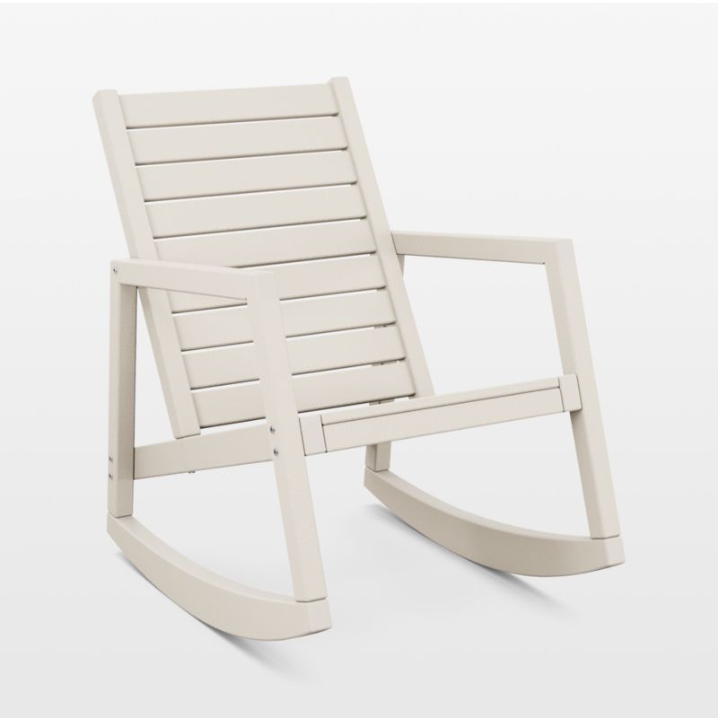 Get comfortable and get rocking with our Loreto outdoor rocking chair. Made of a proprietary blend of sustainable materials including landfill- and ocean-bound plastic that resembles wood, the durable chair features a slatted back and seat that tilts at a comfortable recline. Rockers and armrest combine in a continuous flow for a contemporary twist on a porch classic.