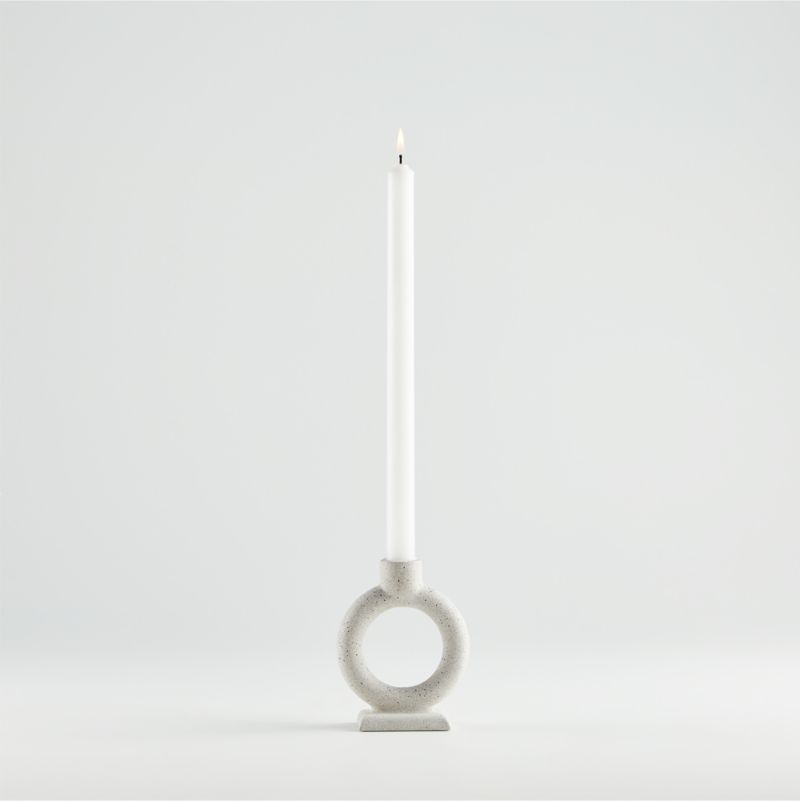 Concrete goes light and luxe in a looped candle holder with a sculptural presence. Like a bold bangle, Lorin curves an airy circle that elevates a taper. Subtle texturing gives the minimalist white candlestick the look and feel of an artisan creation. With its industrial beauty, the small taper holder makes a statement displayed on its own or grouped with the other pieces in our exclusive Lorin collection for an interlocked look.