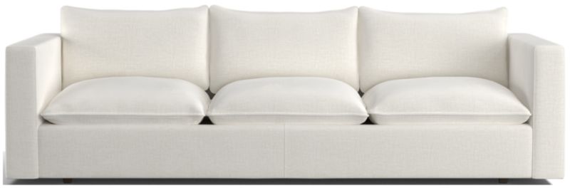 Our roomy Lotus sofa strikes the perfect balance between clean, modern style and cloud-like comfort. Nestled on a low shelter frame, deeply plush pillows are key to the sofa's lounge-worthy luxury, packed with a fluffy down blend and just the right amount of inner support to keep it looking crisp. Just fluff and rotate to keep Lotus looking company-ready. The Lotus Grande Low Sofa is a Crate & Barrel exclusive.
