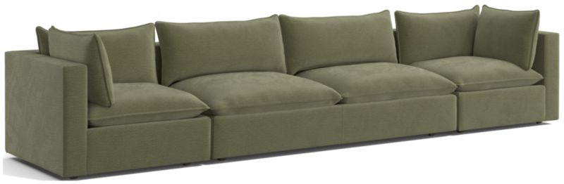 Our Lotus sectional strikes the perfect balance between clean, modern style and cloud-like comfort. Nestled on a low shelter frame, deeply plush pillows are key to the sectional's lounge-worthy luxury, packed with a fluffy down blend and just the right amount of inner support to keep it looking crisp. Just fluff and rotate to keep Lotus looking company-ready. The Lotus Modular 3-Piece Extra Long Low Sofa Sectional is a Crate and Barrel exclusive.