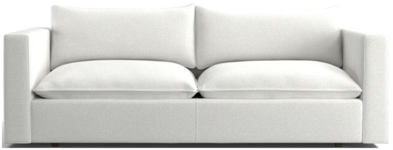 Scaled down to suit smaller-sized spaces, our popular Lotus sofa strikes the perfect balance between clean, modern style and cloud-like comfort. Nestled on a low shelter frame, deeply plush pillows are key to the sofa's lounge-worthy luxury, packed with a fluffy down blend and just the right amount of inner support to keep it looking crisp. Just fluff and rotate to keep Lotus looking company-ready. The Lotus Low Sofa is a Crate & Barrel exclusive.