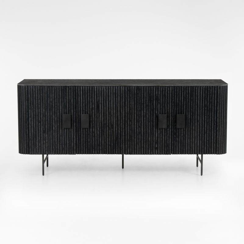 The organic beauty of the top pairs intriguingly with the black oak casing, textured with vertical reeding and subtly whitewashed for cerused-like appeal. The legs give a lift while oversized iron hardware adds drama, opening four doors to reveal two adjustable shelves and plenty of storage space for table linens, serving pieces and other dining room essentials.