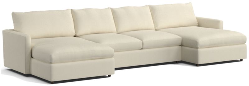 There's a reason it's called Lounge. This double-chaise sectional sofa—part of our ultimate family room collection—features deep, low seats and supersoft back cushions that invite piling on and sinking in. Slim, modern track arms lighten the look and provide maximum sitting space, making the sectional sofa perfect for movie nights or binge-watching your favorite series on TV. Composed of right- and left-arm chaises flanking an armless loveseat, this Lounge Deep three-piece sectional is a Crate & Barrel exclusive.