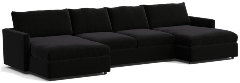 There's a reason it's called Lounge. This double-chaise sectional sofa—part of our ultimate family room collection—features deep, low seats and supersoft back cushions that invite piling on and sinking in. Slim, modern track arms lighten the look and provide maximum sitting space, making the sectional sofa perfect for movie nights or binge-watching your favorite series on TV. Composed of right- and left-arm chaises flanking an armless loveseat, this Lounge Deep three-piece sectional is a Crate & Barrel exclusive.