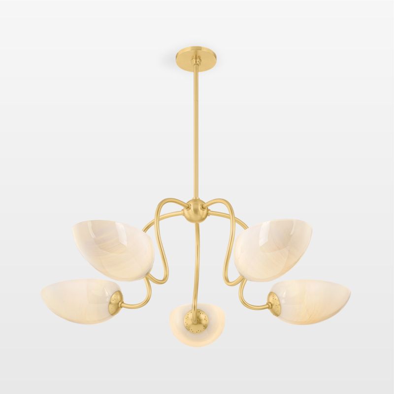 This botanical-inspired chandelier has a subtly vintage look we love. Curving sinuously, the brass-finished fixture supports five leaf-like shades etched on the interior to diffuse light for a soft glow. Graceful and understated, the Loures chandelier glows over a dining table, in an entryway or above a bed.