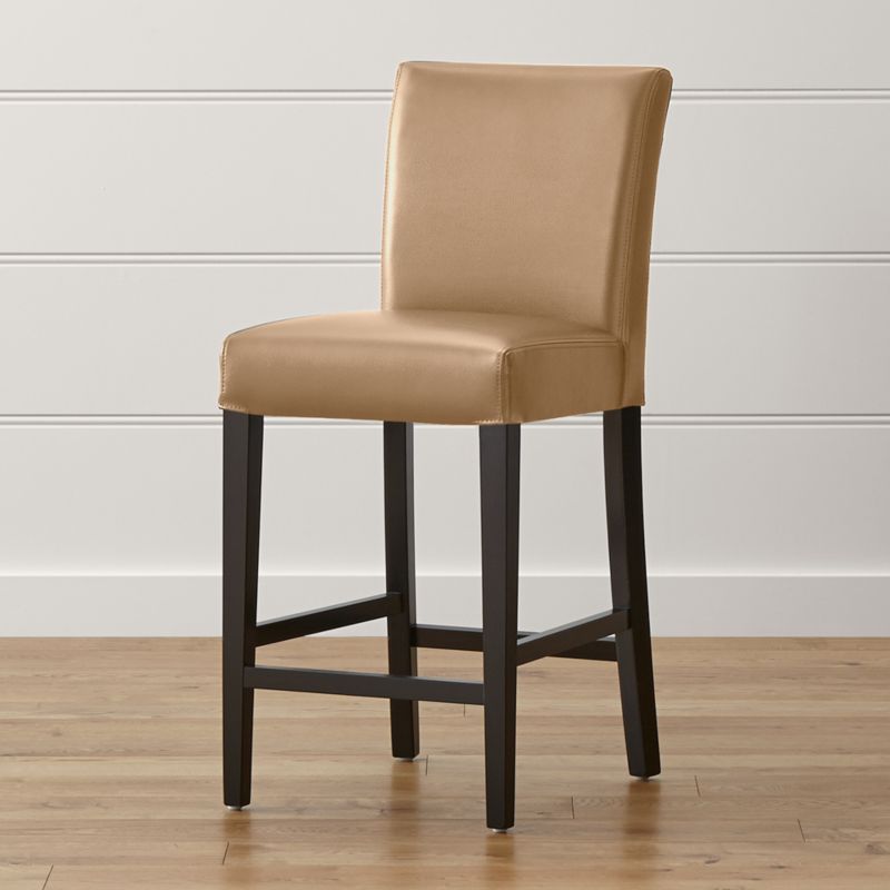 Smartly upholstered in coffee-colored leather with double saddle-stitching, the counter stool's cushioned tight seat and back are perfectly proportioned to the frame's slim ebony-stained legs. Designed and tested for use in commercial spaces such as offices, restaurants and hotels. The Lowe Café Latte Leather Counter Stool is a Crate and Barrel exclusive.