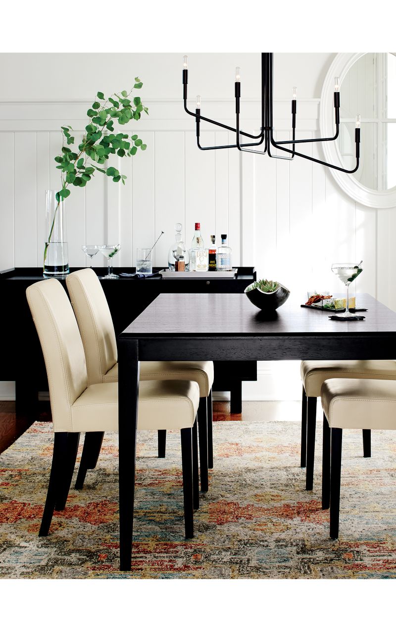 With a generous seat tour Lowe leather side chair takes on a stylish, contemporary stance. Wrapped in soft ivory leather, the Lowe leather dining chair's cushioned tight seat and back are perfectly proportioned to the frame's slim ebony-stained legs. With the finishing touch of double saddle-stitch detailing, the Lowe ivory leather side chair coordinates with the collection's many choices of style and color to customize your ideal seating set-up. The Lowe Ivory Leather Side Chair is a Crate and Barrel exclusive.
