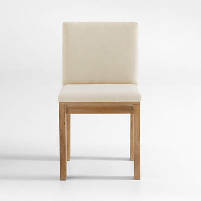 With a roomy cushioned seat and back, our Lowe dining chair is designed for tableside lingering. Linen-blend upholstery in navy blue tailors the cushioned, tight seat in sophistication, partnering perfectly with slim, ebony-stained hardwood legs. Our Lowe collection's many seating options in an array of coordinating leathers and fabrics mix and match for the perfect look. The Lowe upholstered dining chair is a Crate & Barrel exclusive.