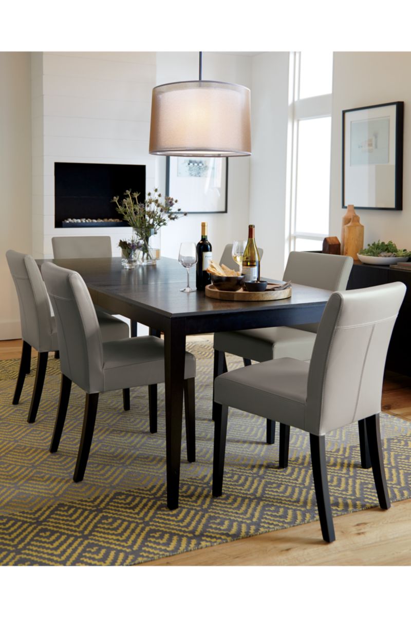 Smartly upholstered in sleek pewter leather with double saddle-stitching, Lowe's cushioned tight seat and back are perfectly proportioned to the frame's slim ebony-stained legs. Lowe seating options offer a wide range of coordinating colors and fabrics for mixing and matching the perfect look. The Lowe Pewter Leather Side Chair is a Crate and Barrel exclusive.