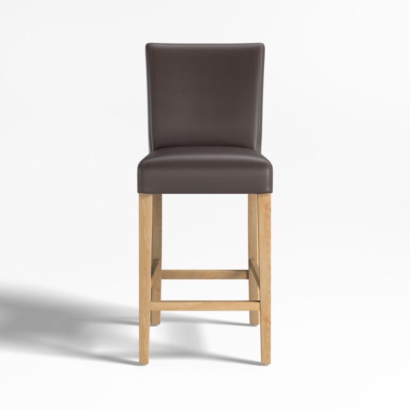 With a roomy cushioned seat and back, our Lowe counter stool is designed for lingering at counters or high-dining tables. Sleek leather in smoky grey tailors the cushioned, tight seat in sophistication, pairing perfectly with slim, natural-finished hardwood legs. Our Lowe collection's many seating options in an array of coordinating leathers and fabrics mix and match for the perfect look. The Lowe upholstered leather counter stool is a Crate & Barrel exclusive.