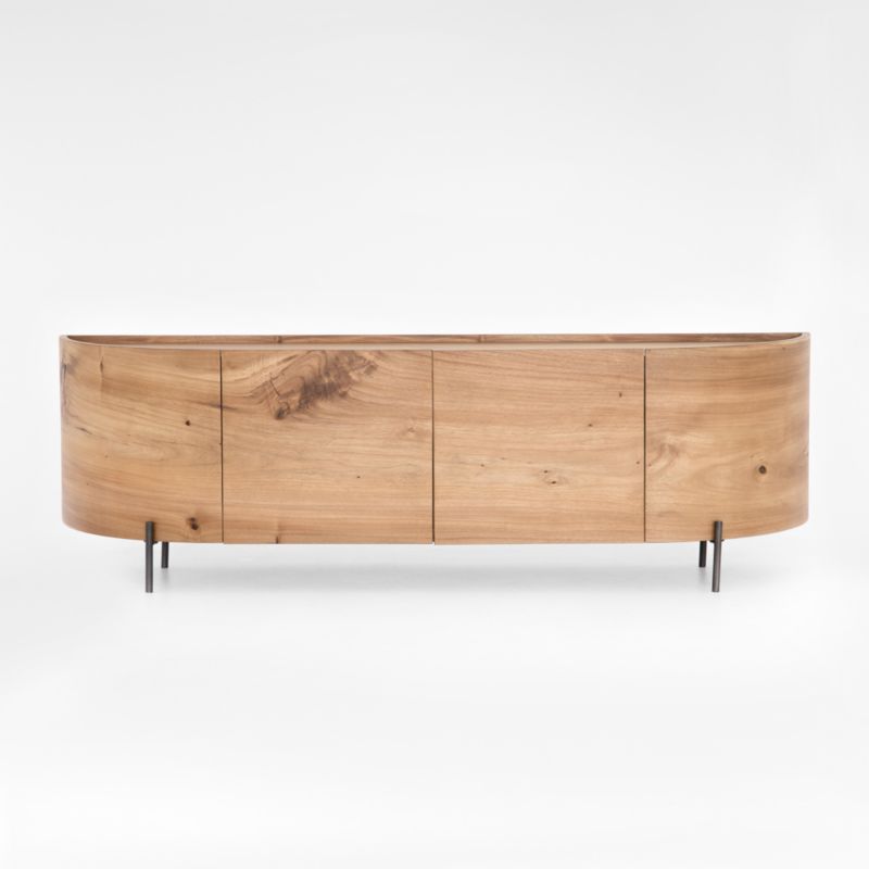 Luke's simple, curved silhouette puts all eyes on tropical hardwood in a sweeping panorama of gorgeous grain. A large, fast-growing and sustainably sourced tree grown throughout Central America, the guanacaste tree yields large slabs that put its creamy sapwood and interlocking grain streaked with honey, red and dark brown on full view. Flat front doors preserve the flow, cleverly concealing a generous storage compartment with two fixed shelves. Our striking console conceals a large storage compartment with two shelves behind a set of doors. Subtle design details include slim bronze-finished iron legs that cradle and uplift the console and an inset top for added definition.