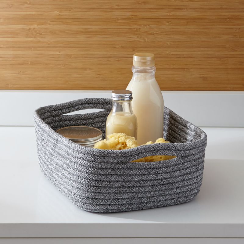 Our Lupe basket goes beyond basic in sleek grey and a braided design that crafts two integrated handles.