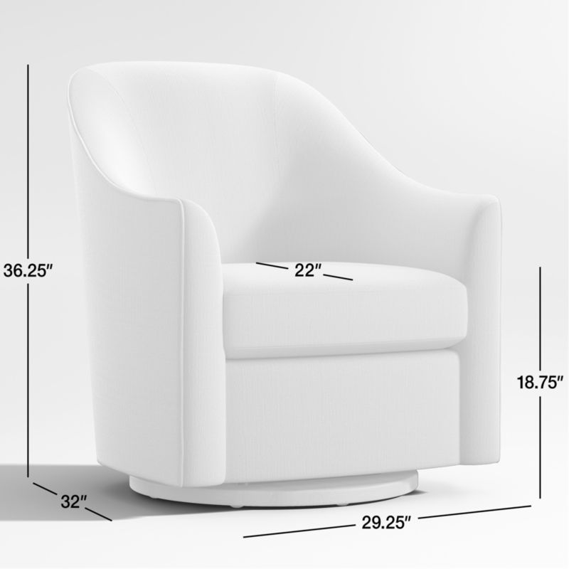 Crisply tailored and perfectly proportioned, our Lyric glider fits in anywhere thanks to its neutral color and petite profile. The curved barrel back and softly sloped arms offer cradling support during feedings, readings and quiet snuggle time, and the elevated base allows for gentle gliding back and forth or turning side to side. Fine details such as welted seams make this swivel chair a transitional piece that can go from nursery to shared family space with grace and ease. Pair it with the matching ottoman for the ultimate resting spot.