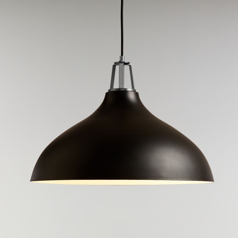 Our Maddox collection mixes and matches finishes and features, creating the perfect combination for your home. Steel shades in a variety of shapes, sizes and modern hues pair matte exteriors and glossy white interiors that reflect light beautifully, accented by decorative socket caps and ceiling plates in a range of finishes. Strikingly simple with clean geometry, this large bell pendant light contrasts a gracefully arched matte black shade with its bright inner surface and brushed nickel details. Hang the adjustable-height pendant over a breakfast nook, kitchen island or sink for a bold, graphic look and useful illumination. Blake Tovin designed our exclusive Maddox collection to be as flexible and functional as the modern home.