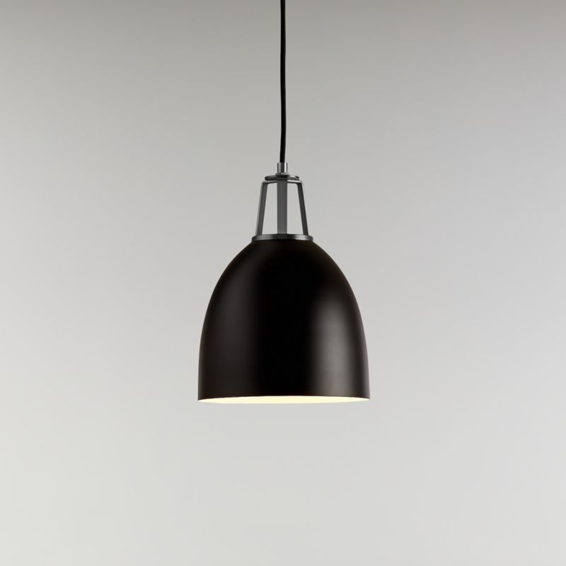 Our Maddox collection mixes and matches finishes and features, creating the perfect combination for your home. Steel shades in a variety of shapes, sizes and modern hues pair matte exteriors and glossy white interiors that reflect light beautifully, accented by decorative socket caps and ceiling plates in a range of finishes. Strikingly simple with clean geometry, this small dome pendant light contrasts a softly rounded matte black shade with its bright inner surface and brushed nickel details. Hang the adjustable-height ceiling light over a breakfast nook, kitchen table or island for a bold, graphic look and useful illumination. Blake Tovin designed our exclusive Maddox collection to be as flexible and functional as the modern home.