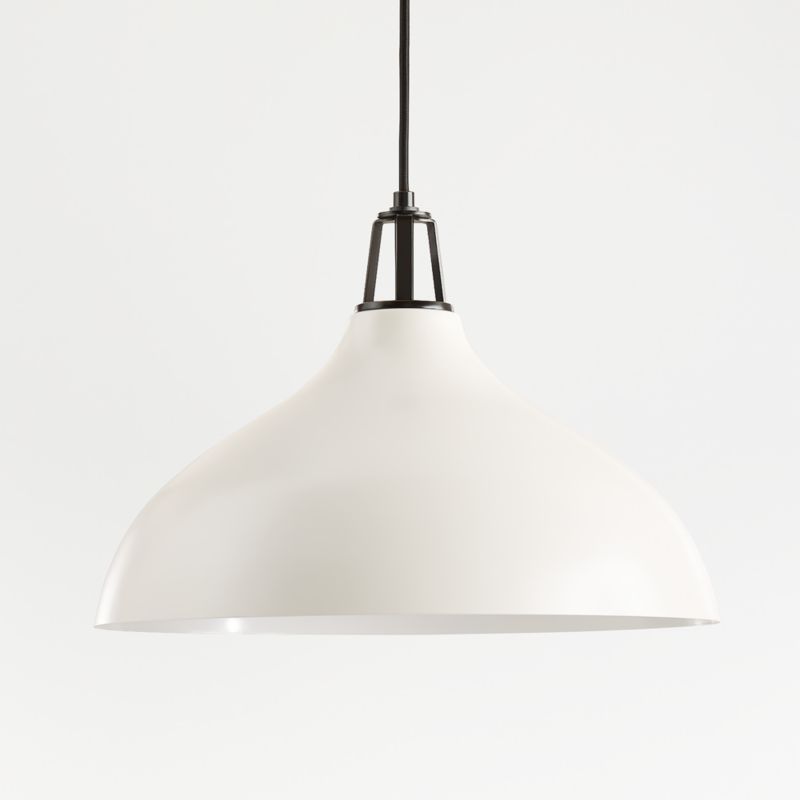 Our Maddox collection mixes and matches finishes and features, creating the perfect combination for your home. Steel shades in a variety of shapes, sizes and modern hues pair matte exteriors and glossy white interiors that reflect light beautifully, accented by decorative socket caps and ceiling plates in a range of finishes. Strikingly simple with bold geometry and black details, this large bell pendant light in matte and shiny white arches gracefully. Hang the adjustable-height ceiling light over a dining table, kitchen island or reading nook for a clean, graphic look and useful illumination. Blake Tovin designed our exclusive Maddox collection to be as flexible and functional as the modern home.