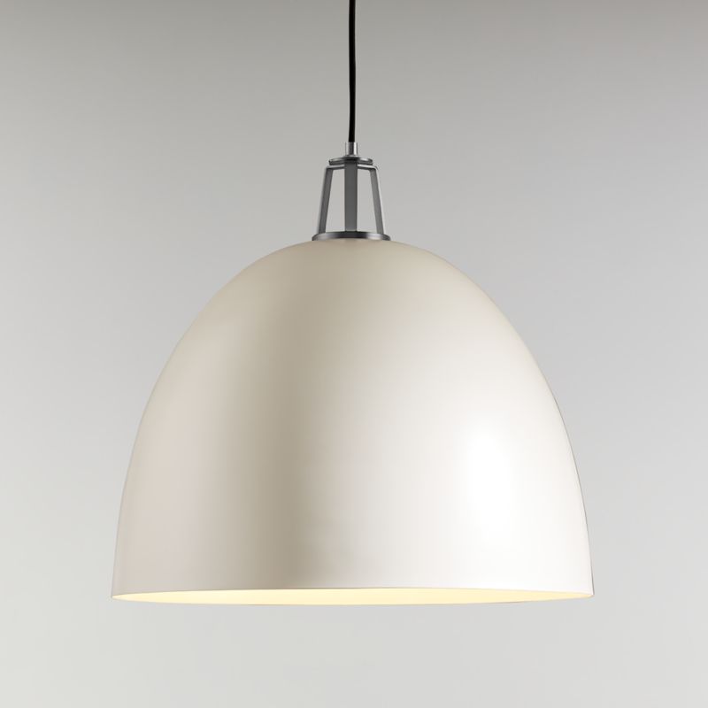 Our Maddox collection mixes and matches finishes and features, creating the perfect combination for your home. Steel shades in a variety of shapes, sizes and modern hues pair matte exteriors and glossy white interiors that reflect light beautifully, accented by decorative socket caps and ceiling plates in a range of finishes. Strikingly simple with bold geometry and brushed nickel details, this large dome pendant light in matte and shiny white curves softly. Hang the adjustable-height ceiling light over a kitchen island, reading nook or dining table for a clean, graphic look and useful illumination. Blake Tovin designed our exclusive Maddox collection to be as flexible and functional as the modern home.