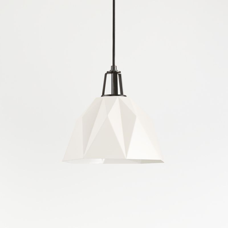 Our Maddox collection mixes and matches finishes and features, creating the perfect combination for your home. Steel shades in a variety of shapes, sizes and modern hues pair matte exteriors and glossy white interiors that reflect light beautifully, accented by decorative socket caps and ceiling plates in a range of finishes. Strikingly simple with bold geometry and black details, this small faceted pendant light in matte and shiny white boasts origami-like angles. Hang the adjustable-height ceiling light over a kitchen sink, bar cart or bedside table for a fascinatingly dimensional look and useful illumination. Blake Tovin designed our exclusive Maddox collection to be as flexible and functional as the modern home.