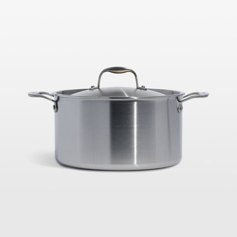 Italian-made stainless steel cookware from Made In brings professional-level quality and durability home. Five-ply construction envelops a triple aluminum core for optimal heat conduction in stainless steel cladding. The cooking surface is non-reactive, the magnetic exterior is induction compatible, and the layered structure eliminates hot spots (meaning less stuck-on food and less scrubbing). Perfectly sized for simmering, braising and boiling, the stockpot is topped with a tight-fitting lid that helps bring water to a boil in mere minutes. Loop handles make the pan comfortable to carry, and an angled rim ensures easy pouring. Timeless with traditional styling, the stockpot pairs with our other Made In cookware to outfit your kitchen beautifully.