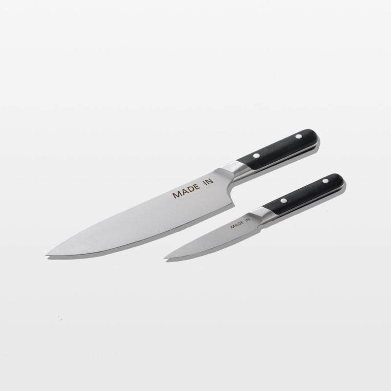 Crafted in Thiers—the French capital of cutlery—Made In knives bring professional-grade quality and durability home. Each blade is hand-forged by expert artisans out of a single rod of high-quality stainless steel for improved hardness, edge retention and corrosion resistance. The exceptionally sharp edges feature asymmetrical beveling, which promotes effortless slicing and requires only infrequent sharpening. Fitted with black handles that provide a comfortable grip, the paring and chef's knives in this set handle a wide range of cutting tasks from intricate trimming to slicing, dicing and chopping.