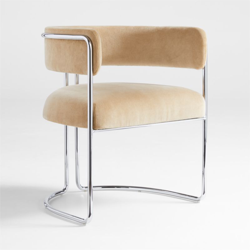 Our Malak dining chair looks sleek and contemporary from all angles. The Bauhaus-inspired design flows tubular polished chrome into one continuous line flowing from back to arms to base. Amply padded cushioning floats the comfortable seat and hugs the backrest to the arm chair's frame for superior lumbar support. Cotton-blend velvet upholstery in neutral camel, providing luxurious, soft-to-the-touch texture. A graceful complement to any of our dining tables, Malak also makes a striking accent chair.