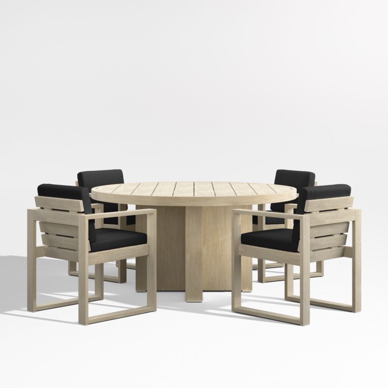 Settle into the enduring coastal style of Mallorca. Designed to last season after season, the dining table and chair set showcases the long-lasting durability and natural beauty of eucalyptus wood, which has been painted and wirebrushed to resemble naturally weathered driftwood. The round dining table features a round slatted top on a sculptural X base, pairing perfectly with the modern lines and bold geometry of the dining chairs. Soft-yet-supportive cushions are covered in outdoor-friendly ivory fabric or your choice of colors in performance Sunbrella fabric.