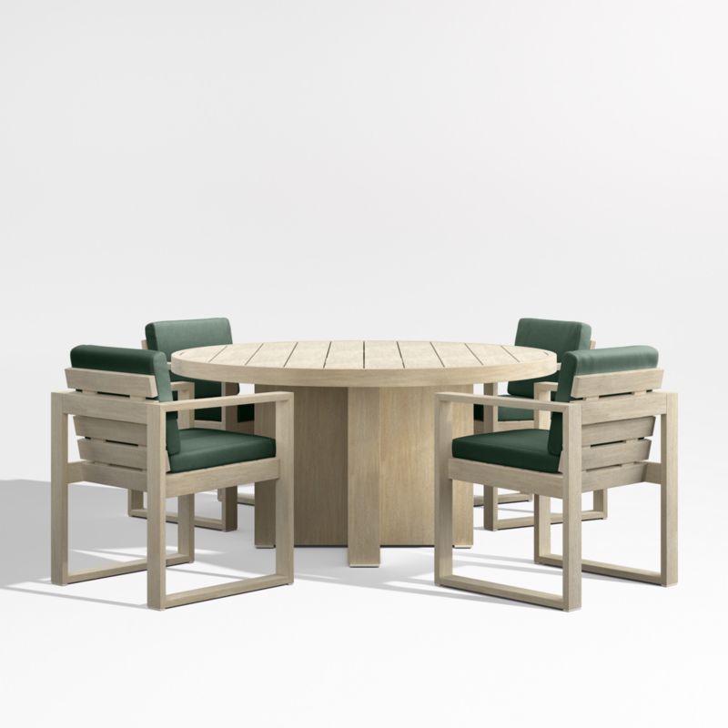 Settle into the enduring coastal style of Mallorca. Designed to last season after season, the dining table and chair set showcases the long-lasting durability and natural beauty of eucalyptus wood, which has been painted and wirebrushed to resemble naturally weathered driftwood. The round dining table features a round slatted top on a sculptural X base, pairing perfectly with the modern lines and bold geometry of the dining chairs. Soft-yet-supportive cushions are covered in outdoor-friendly ivory fabric or your choice of colors in performance Sunbrella fabric.