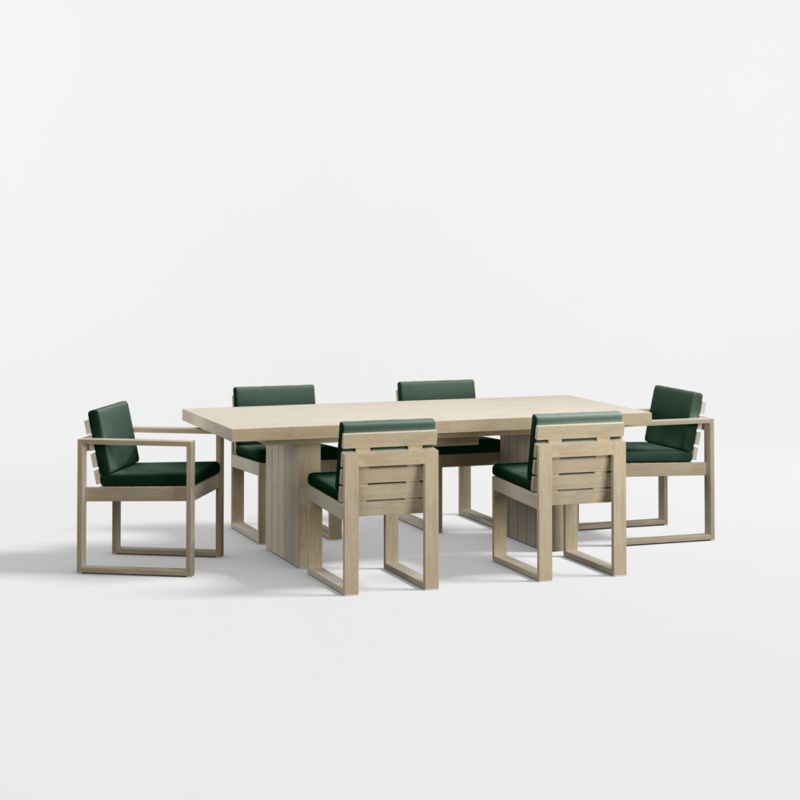 Settle into the enduring coastal style of Mallorca. Designed to last season after season, the extension dining table and chair set showcases the long-lasting durability and natural beauty of eucalyptus wood, which has been painted and wirebrushed to resemble naturally weathered driftwood. The round dining table features a round slatted top on a sculptural X base, pairing perfectly with the modern lines and bold geometry of the six dining chairs. Soft-yet-supportive cushions are covered in outdoor-friendly ivory fabric or your choice of colors in performance Sunbrella fabric.