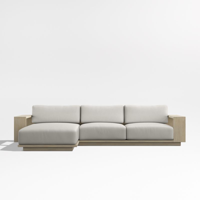 Settle into the enduring coastal comfort of Mallorca. Designed to last season after season, the sectional showcases the long-lasting durability and natural beauty of eucalyptus wood, which has been painted and wirebrushed to resemble naturally weathered driftwood. The linear frame's modern lines and bold geometry feature wide arms and a plinth base for a contemporary look. Soft-yet-supportive cushions are covered in outdoor-friendly ivory fabric or your choice of colors in performance Sunbrella fabric.