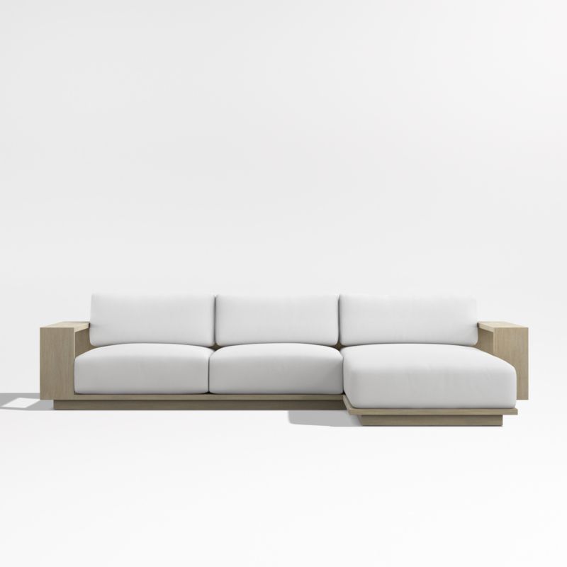 Settle into the enduring coastal comfort of Mallorca. Designed to last season after season, the sectional showcases the long-lasting durability and natural beauty of eucalyptus wood, which has been painted and wirebrushed to resemble naturally weathered driftwood. The linear frame's modern lines and bold geometry feature wide arms and a plinth base for a contemporary look. Soft-yet-supportive cushions are covered in outdoor-friendly ivory fabric or your choice of colors in performance Sunbrella fabric.