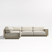Settle into the enduring coastal comfort of Mallorca. Designed to last season after season, the sectional showcases the long-lasting durability and natural beauty of eucalyptus wood, which has been painted and wirebrushed to resemble naturally weathered driftwood. The linear frame's modern lines and bold geometry feature wide arms and a plinth base for a contemporary look. Soft-yet-supportive cushions are covered in outdoor-friendly ivory fabric or your choice of colors in performance Sunbrella fabric.