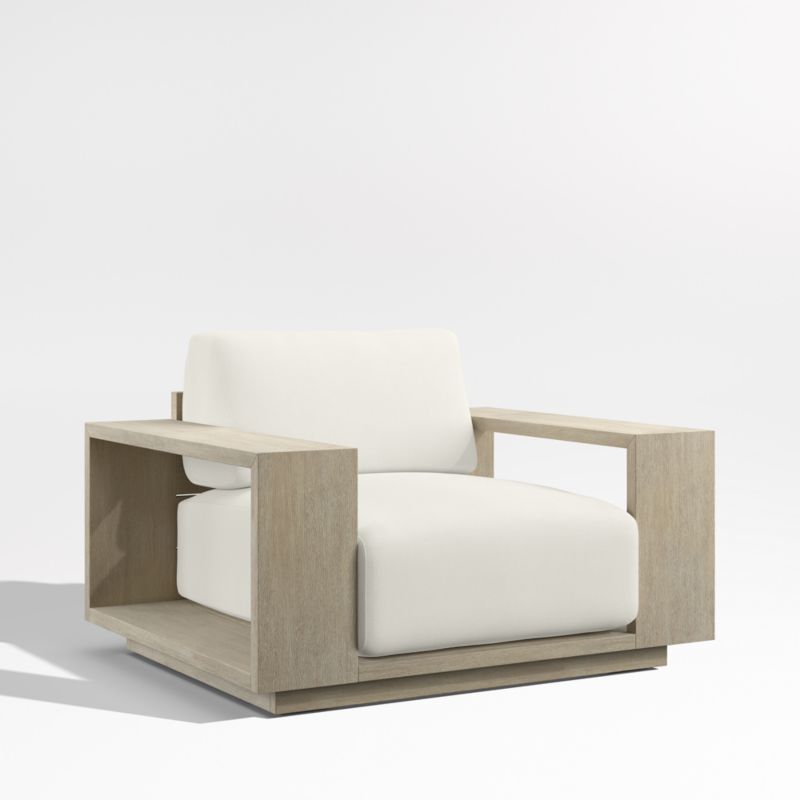 Settle into the enduring coastal comfort of Mallorca. Designed to last season after season, the lounge chair showcases the long-lasting durability and natural beauty of eucalyptus wood, which has been painted and wirebrushed to resemble naturally weathered driftwood. The linear frame's modern lines and bold geometry feature wide arms and a plinth base for a contemporary look. Soft-yet-supportive cushions are covered in outdoor-friendly ivory fabric or your choice of colors in performance Sunbrella fabric.