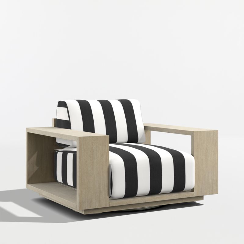 Settle into the enduring coastal comfort of Mallorca. Designed to last season after season, the swivel chair showcases the long-lasting durability and natural beauty of eucalyptus wood, which has been painted and wirebrushed to resemble naturally weathered driftwood. The linear frame's modern lines and bold geometry feature wide arms and a plinth base for a contemporary look. Soft-yet-supportive cushions are covered in outdoor-friendly ivory fabric or your choice of colors in performance Sunbrella fabric.