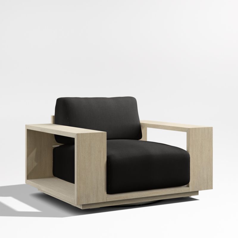 Settle into the enduring coastal comfort of Mallorca. Designed to last season after season, the swivel chair showcases the long-lasting durability and natural beauty of eucalyptus wood, which has been painted and wirebrushed to resemble naturally weathered driftwood. The linear frame's modern lines and bold geometry feature wide arms and a plinth base for a contemporary look. Soft-yet-supportive cushions are covered in outdoor-friendly ivory fabric or your choice of colors in performance Sunbrella fabric.