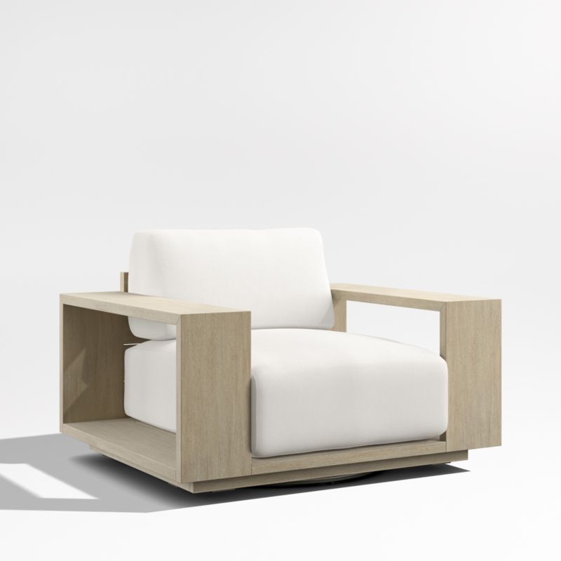Settle into the enduring coastal comfort of Mallorca. Designed to last season after season, the swivel chair showcases the long-lasting durability and natural beauty of eucalyptus wood, which has been painted and wirebrushed to resemble naturally weathered driftwood. The linear frame's modern lines and bold geometry feature wide arms and a plinth base for a contemporary look. Soft-yet-supportive cushions are covered in outdoor-friendly ivory fabric or your choice of colors in performance Sunbrella fabric.