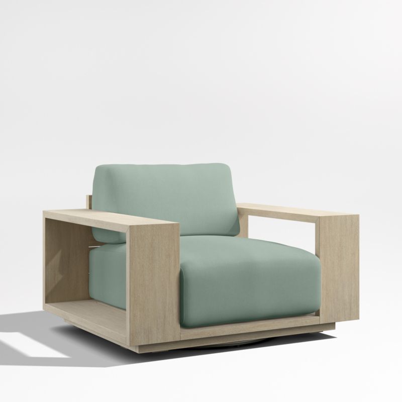 Settle into the enduring coastal comfort of Mallorca. Designed to last season after season, the swivel chair showcases the long-lasting durability and natural beauty of eucalyptus wood, which has been painted and wirebrushed to resemble naturally weathered driftwood. The linear frame's modern lines and bold geometry feature wide arms and a plinth base for a contemporary look. Soft-yet-supportive cushions are covered in outdoor-friendly ivory fabric or your choice of colors in performance Sunbrella fabric.