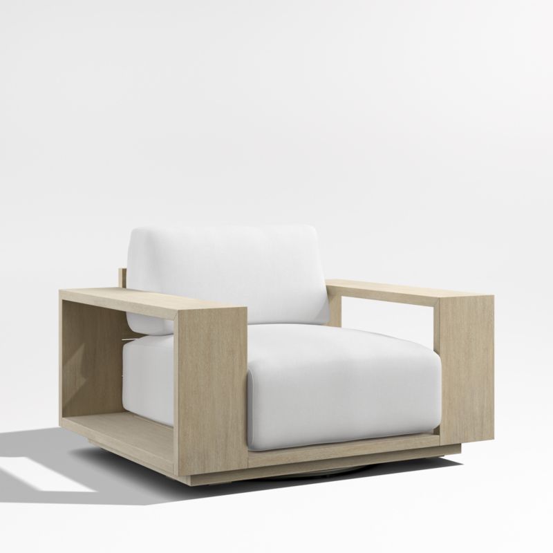 Settle into the enduring coastal comfort of Mallorca. Designed to last season after season, the swivel chair showcases the long-lasting durability and natural beauty of eucalyptus wood, which has been painted and wirebrushed to resemble naturally weathered driftwood. The linear frame's modern lines and bold geometry feature wide arms and a plinth base for a contemporary look. Soft-yet-supportive cushions are covered in outdoor-friendly ivory fabric or your choice of colors in performance Sunbrella fabric.