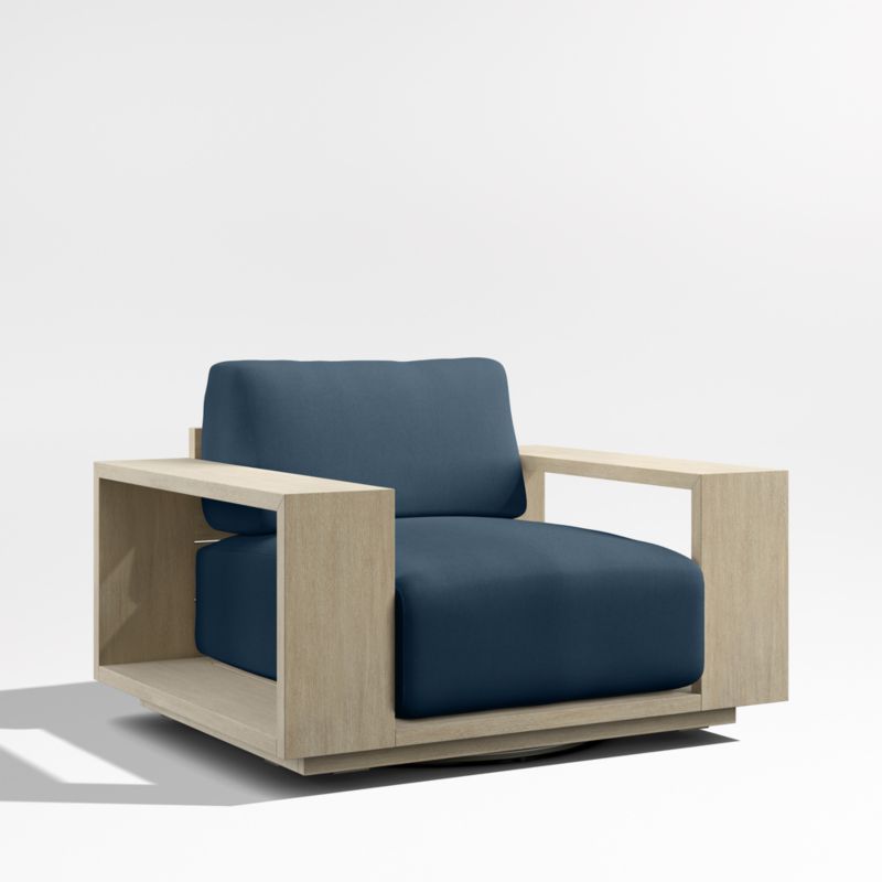 Settle into the enduring coastal comfort of Mallorca. Designed to last season after season, the swivel chair showcases the long-lasting durability and natural beauty of eucalyptus wood, which has been painted and wirebrushed to resemble naturally weathered driftwood. The linear frame's modern lines and bold geometry feature wide arms and a plinth base for a contemporary look. Soft-yet-supportive cushions are covered in outdoor-friendly ivory fabric or your choice of colors in performance Sunbrella fabric.