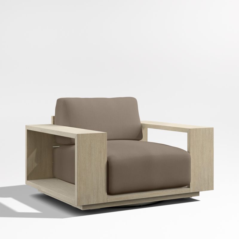 Settle into the enduring coastal comfort of Mallorca. Designed to last season after season, the swivel chair showcases the long-lasting durability and natural beauty of eucalyptus wood, which has been painted and wirebrushed to resemble naturally weathered driftwood. The linear frame's modern lines and bold geometry feature wide arms and a plinth base for a contemporary look. Soft-yet-supportive cushions are covered in outdoor-friendly ivory fabric or your choice of colors in performance Sunbrella fabric.