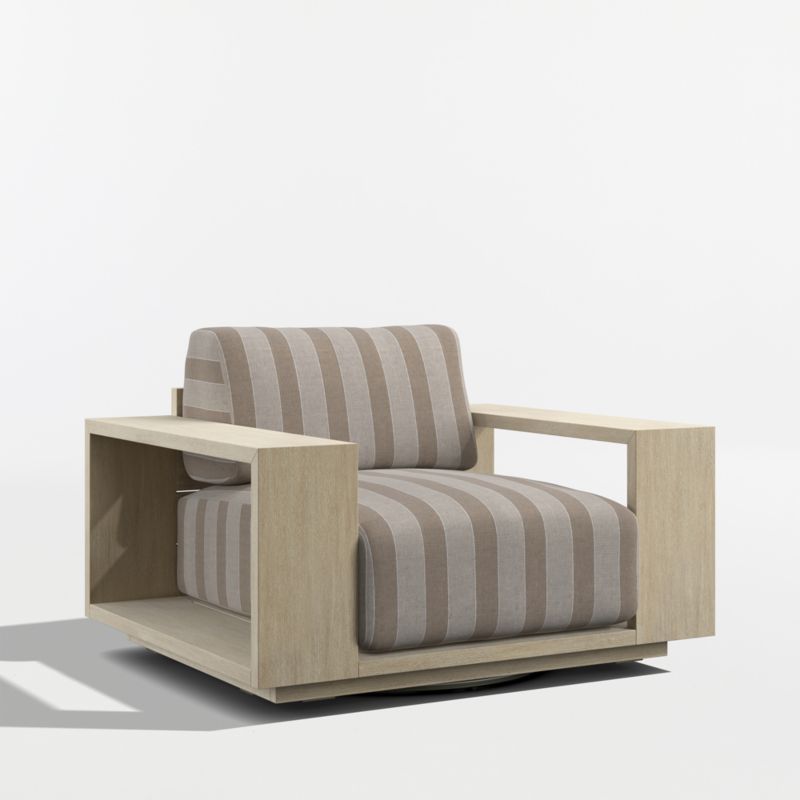 Settle into the enduring coastal comfort of Mallorca. Designed to last season after season, the swivel chair showcases the long-lasting durability and natural beauty of eucalyptus wood, which has been painted and wirebrushed to resemble naturally weathered driftwood. The linear frame's modern lines and bold geometry feature wide arms and a plinth base for a contemporary look. Soft-yet-supportive cushions are covered in outdoor-friendly ivory fabric or your choice of colors in performance Sunbrella fabric.