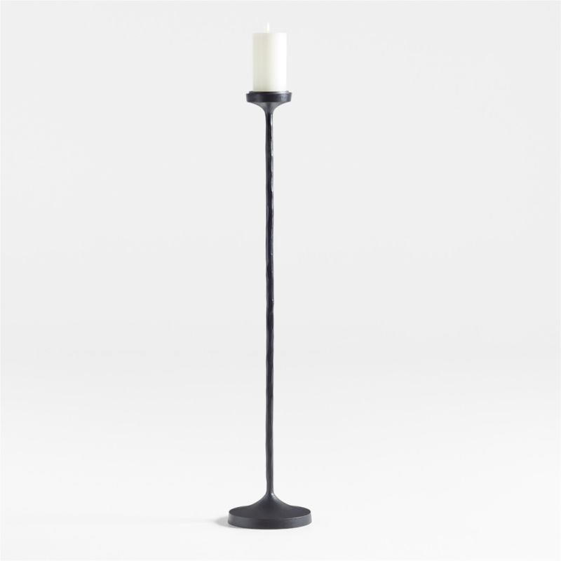 Our freestanding Maloy floor candle holder graces any spot in the home with atmospheric illumination and a touch of drama. Hand-hammered by skilled craftspeople, the black iron stand stretches a slender stem from a sturdy base to a platform top that accommodates taper and pillar candles. We love Maloy's height, unique texture and timeless presence in an entryway, hallway or any corner that could use an eye-catching accent.